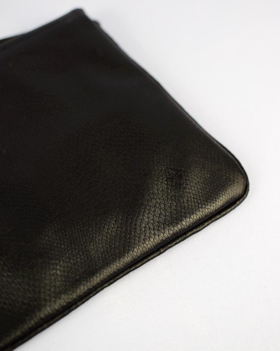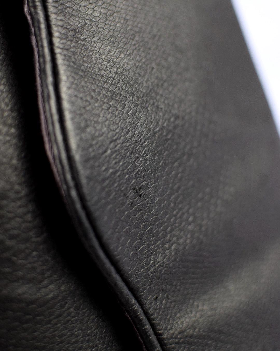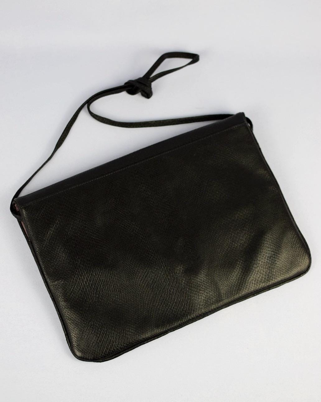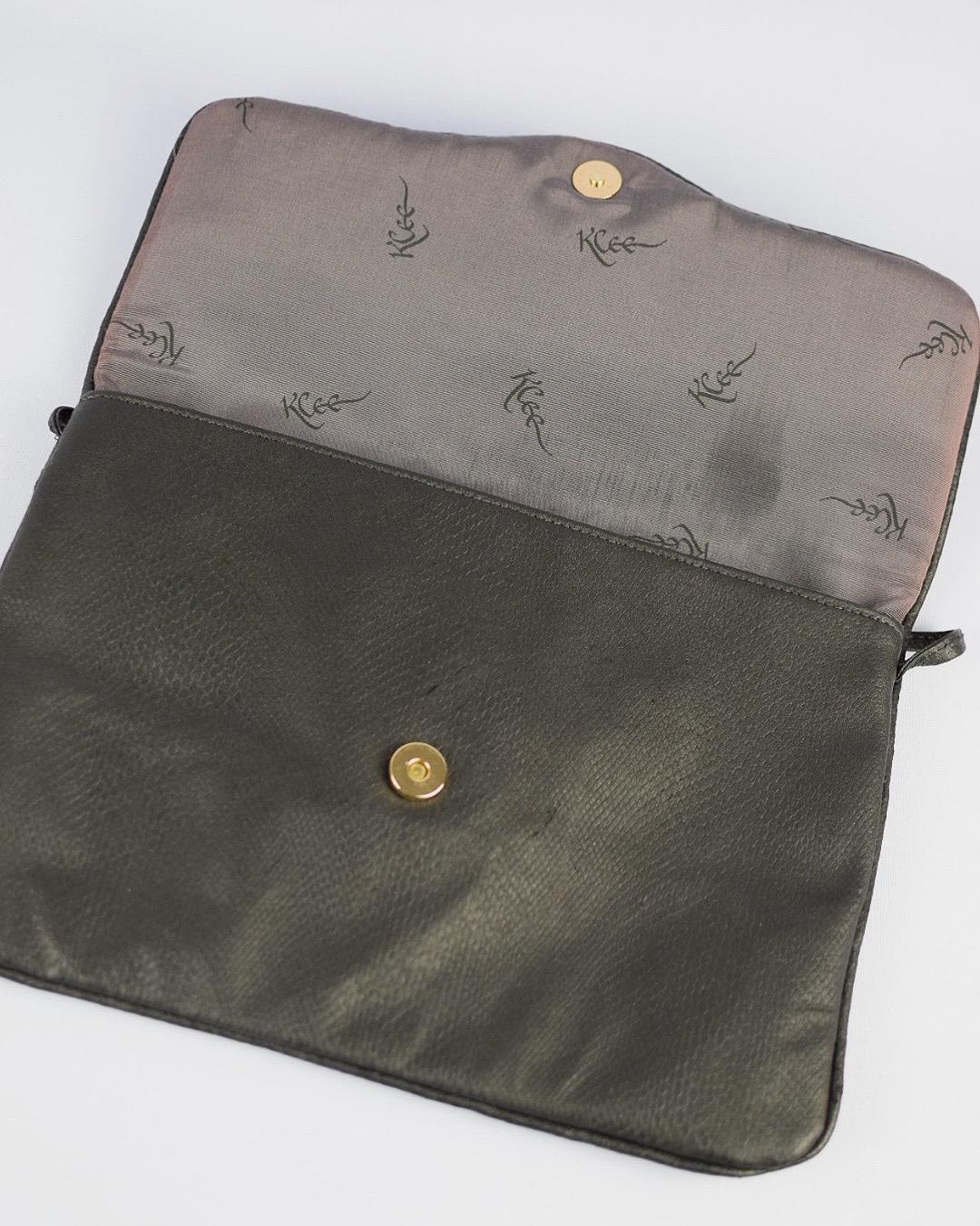Step into retro elegance with this vintage 1980s Klee purse, crafted from textured faux black leather and fully lined with black fabric stamped “Klee” throughout. The sleek shoulder bag features a stylish 80s silhouette and is in good vintage condition, showing only one darker area/stain inside the lining and a couple of light surface scratches on the exterior (as pictured). Measuring 10″ long × 7″ wide × ½″ deep, it’s the perfect accessory for vintage style lovers and those seeking unique fashion statements.