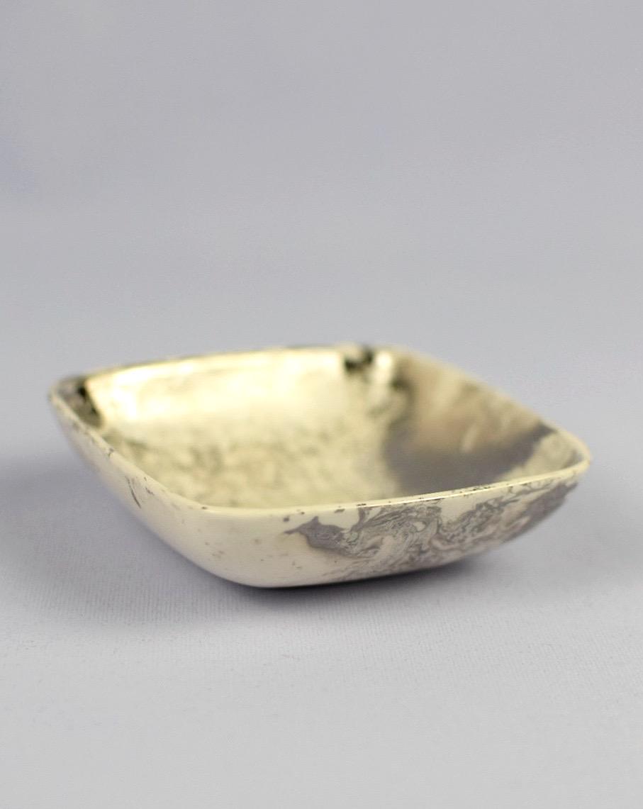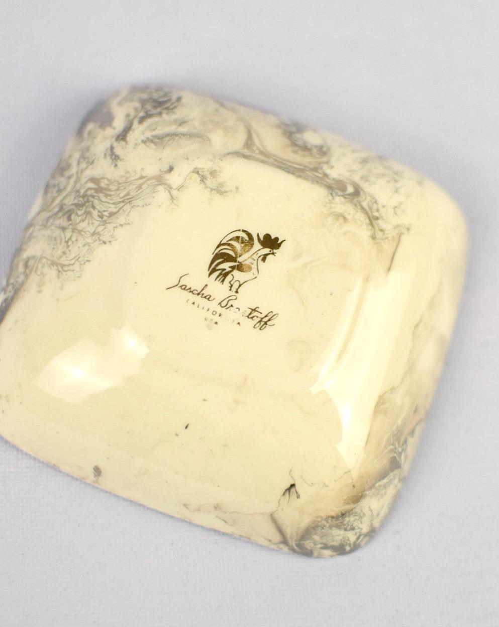 Elevate your vanity or desk with this stylish mid‑century catchall. Crafted in a rounded‑square silhouette and finished in a glossy white glaze with elegant silver marbling, this dish is stamped with the genuine Sascha Brastoff signature on the bottom—confirming its authenticity and collectible mid‑century status. Stylish storage for rings, jewelry, and more.