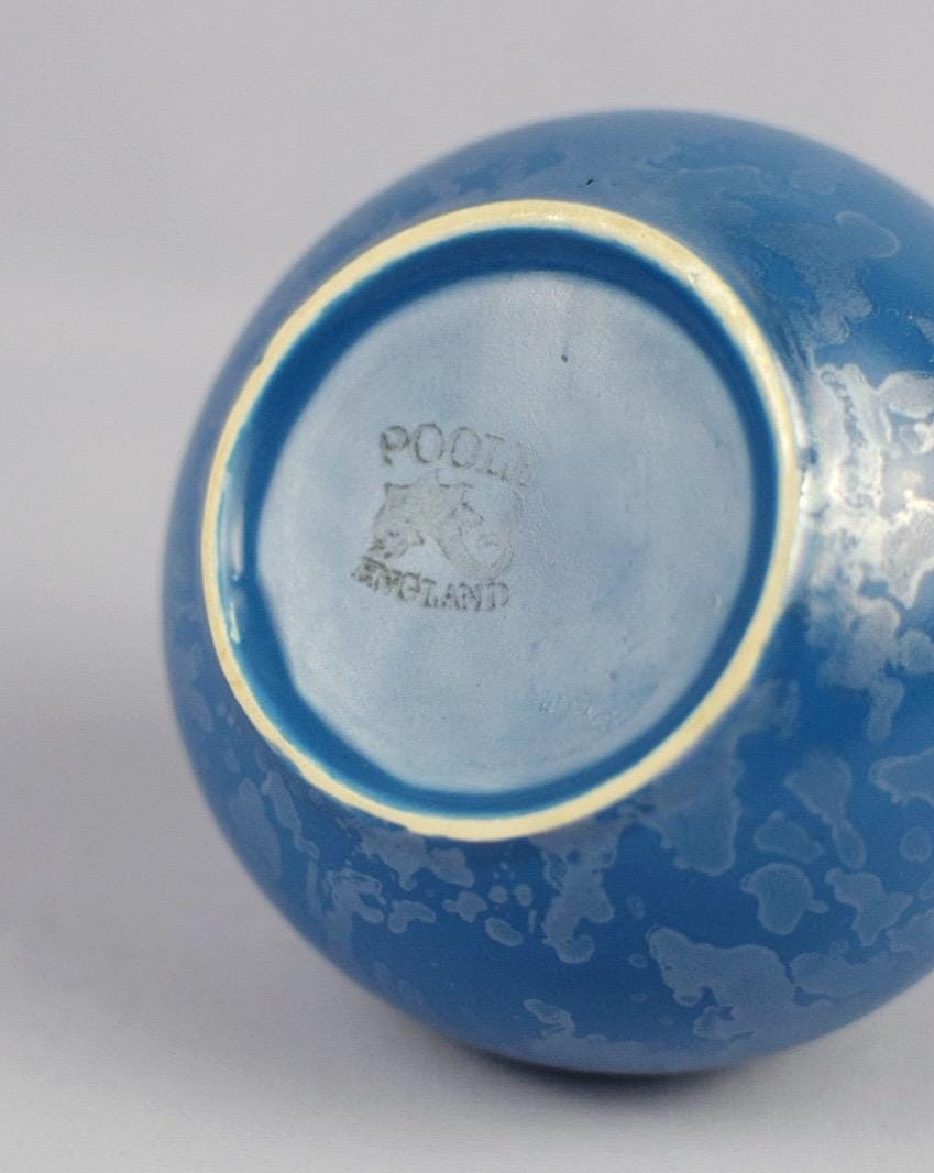 This stunning blue mid‑century vase is by Poole Pottery, crafted in England with the brand’s renowned quality and design legacy. Standing approximately 6″ tall and 5″ wide, the vase showcases a beautifully mottled glaze with a subtle iridescent sheen that catches the light—perfect for mid‑century and vintage décor enthusiasts.
