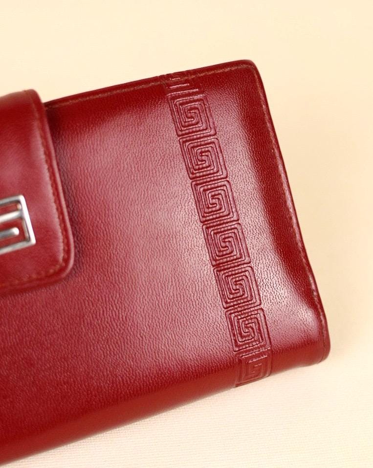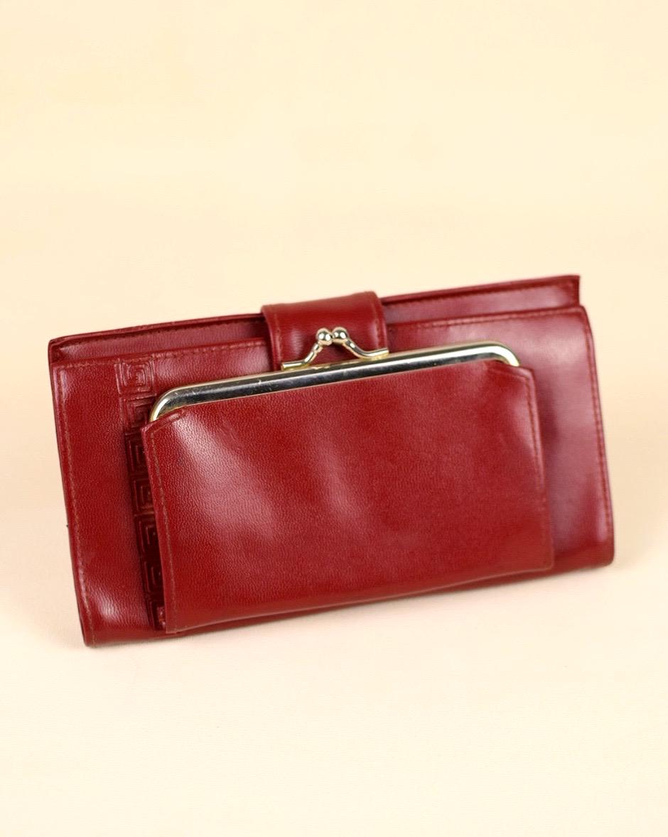 Celebrate nostalgic 80s style with this vintage red faux leather wallet featuring an elegant Greek key pattern and a polished silver-tone “S” clasp. Equipped with a built-in calculator, checkbook compartment, and a snap-closure coin purse on the back, it’s as functional as it is stylish.