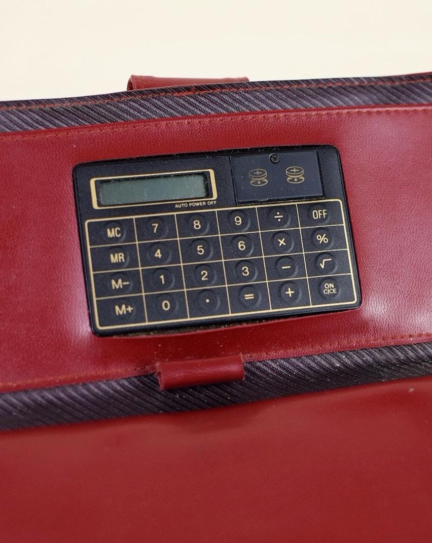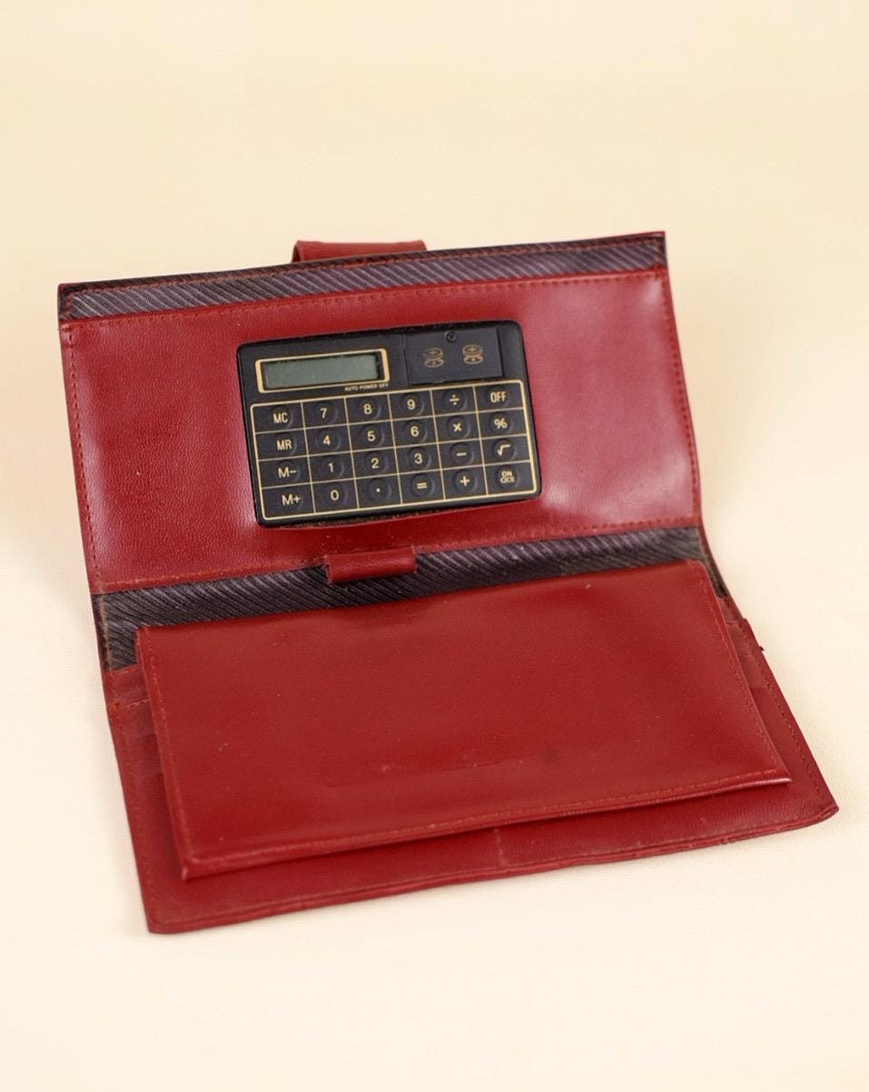 Interior Layout: 12-digit vintage calculator, dedicated checkbook slot, multiple bill/card compartments