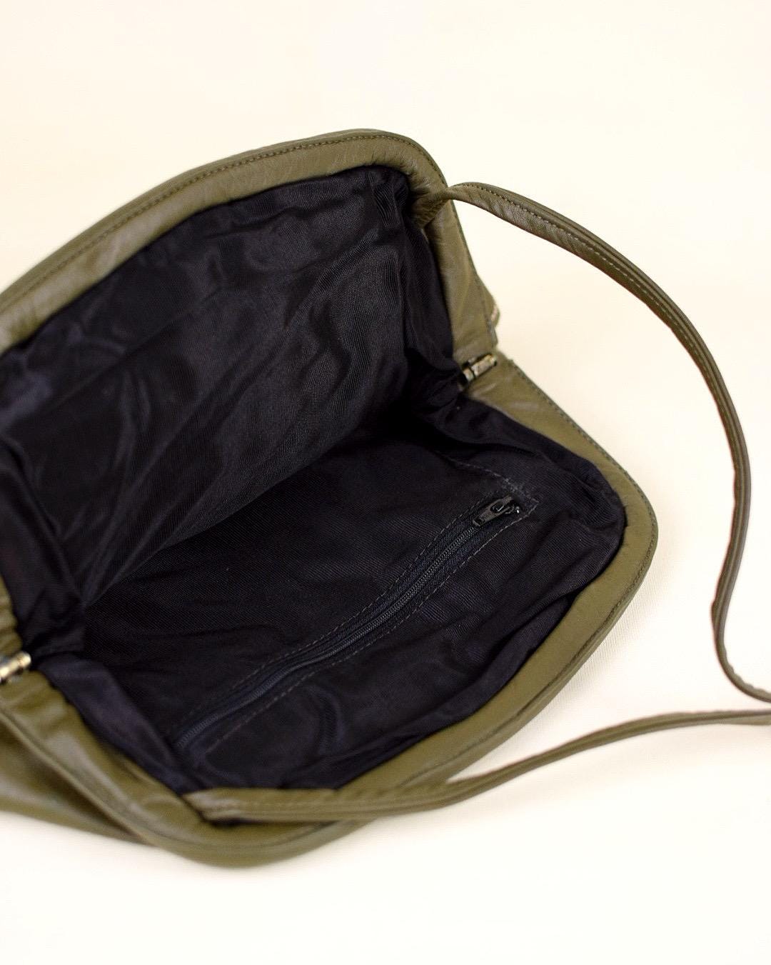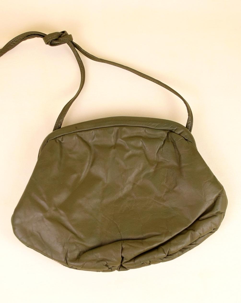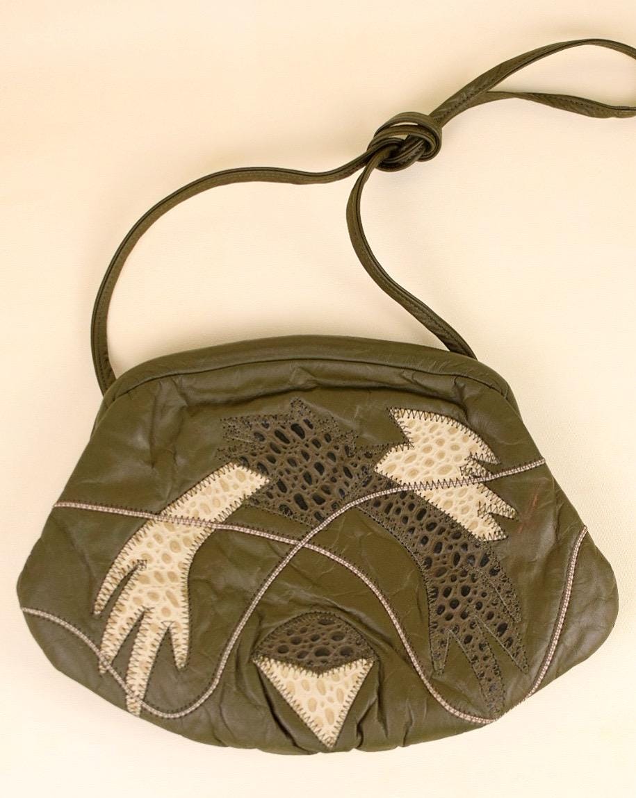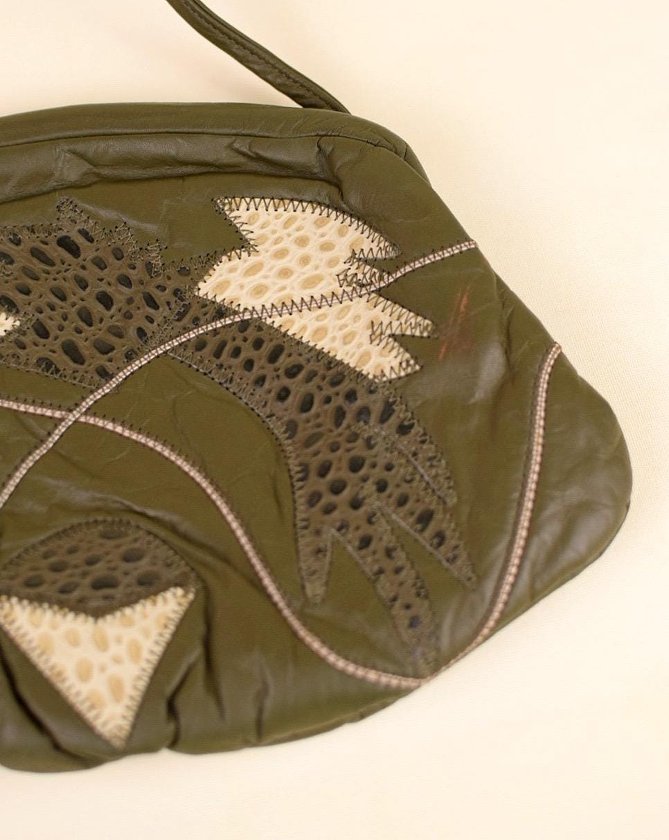 Add a splash of retro sophistication to any outfit with this vintage 1980s leather patchwork purse. Featuring mixed olive green and beige reptile-look patches, it delivers rich texture and easy versatility. The opening hides an invisible magnetic clasp, while the shoulder strap adds ease of carry. Inside, the black lining reveals classic ’80s styling—ideal for fashion lovers seeking nostalgic flair.