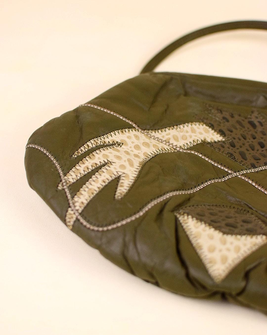 Materials: Mixed (faux?) leather patches in olive, beige, and reptile textures