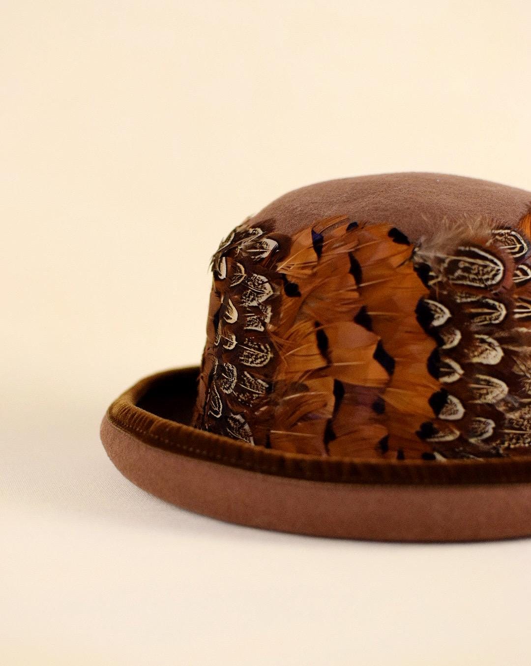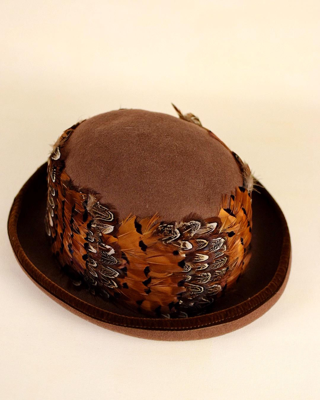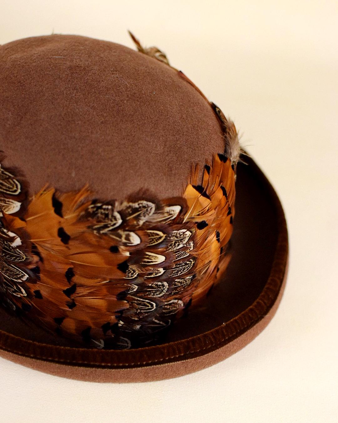 Elevate your vintage fashion collection with this stunning mid-century wool felt hat, featuring rich brown wool adorned with feathers in warm shades of orange, brown, and white, trimmed with luxurious velvet on the brim.