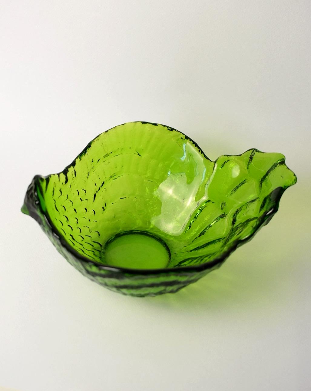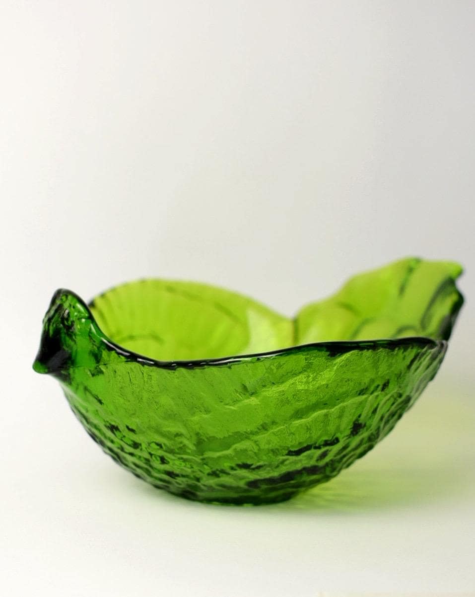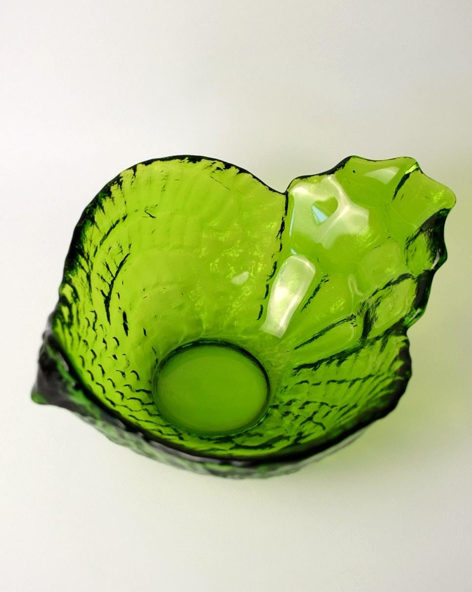 Design: Hen molded bowl in textured, vibrant green glass—classic mid‑century novelty form loved by collectors