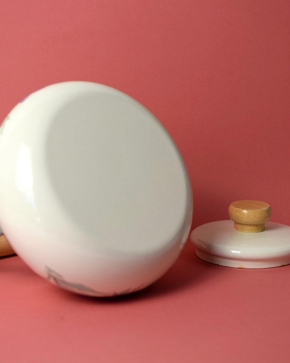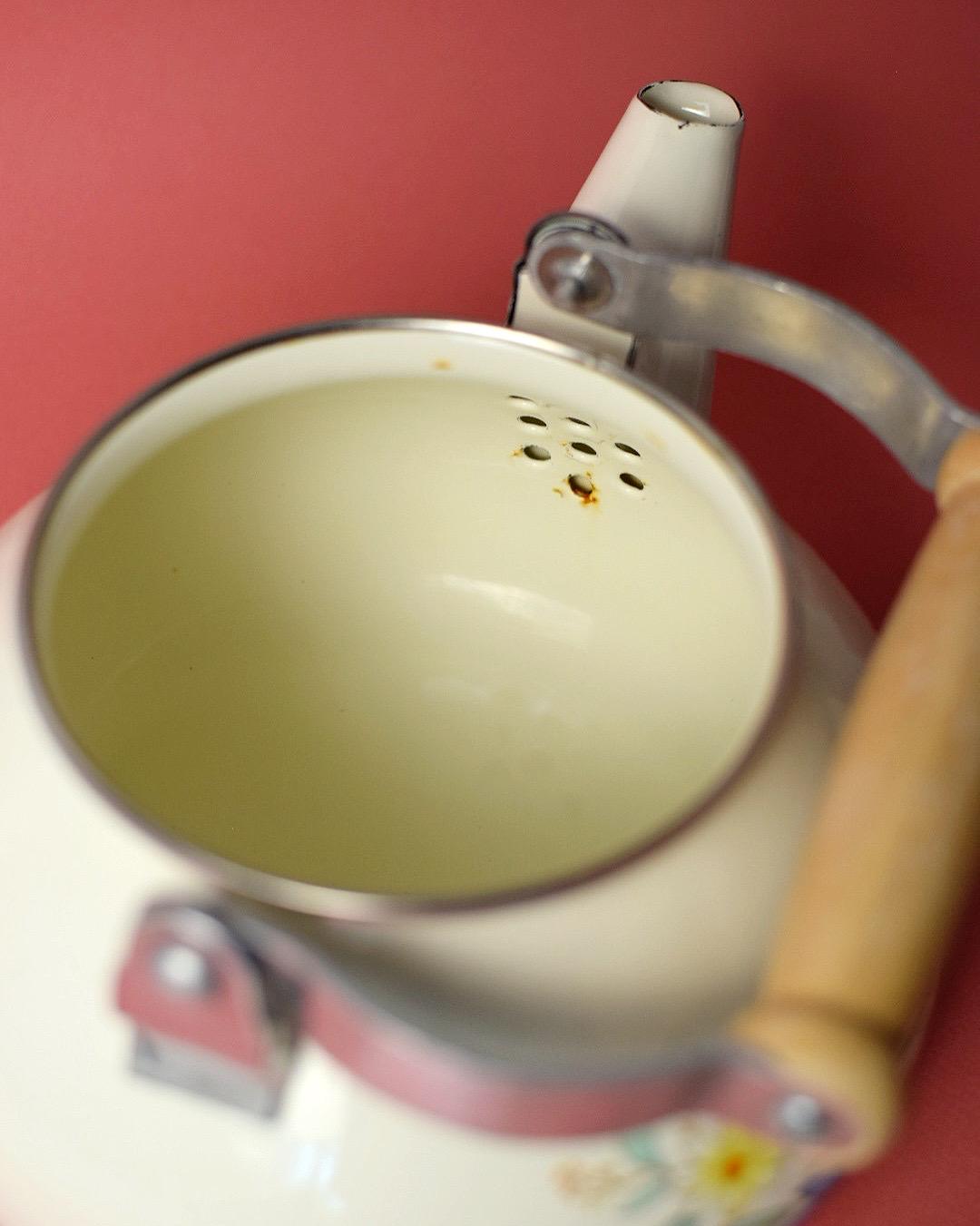 Condition: Good vintage condition; enamel is intact and shiny. There is some wear on the enamel on the inside of the teapot, as well as light wear on the wooden handle.