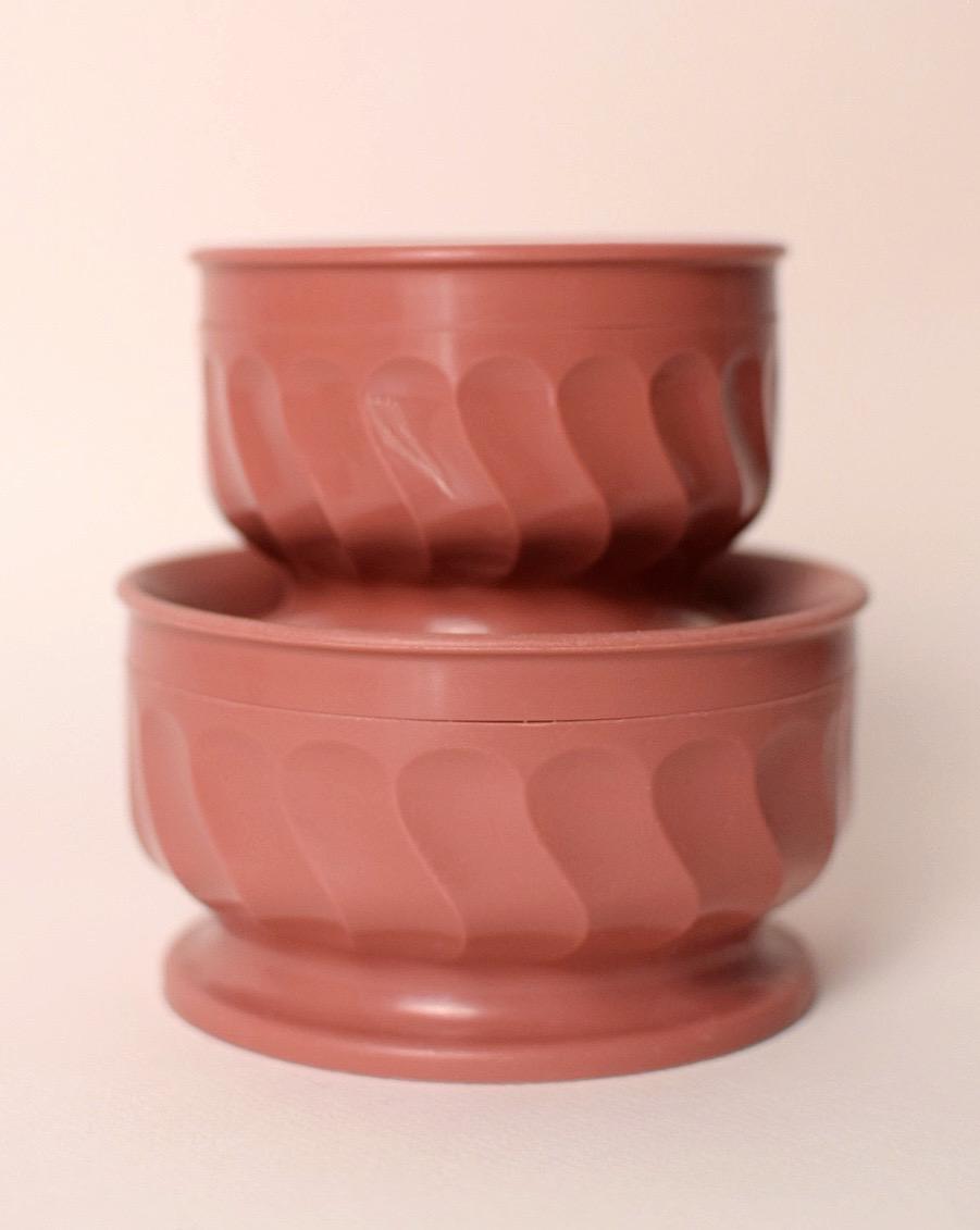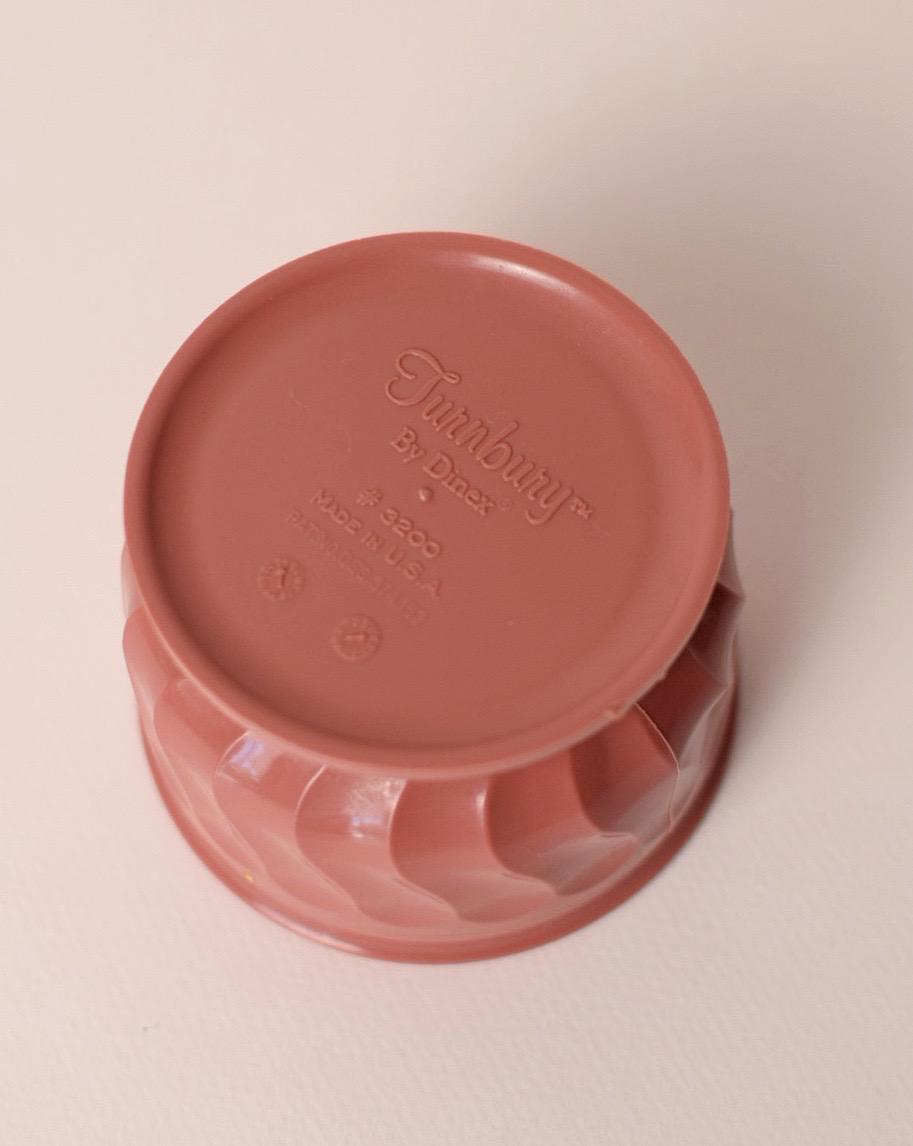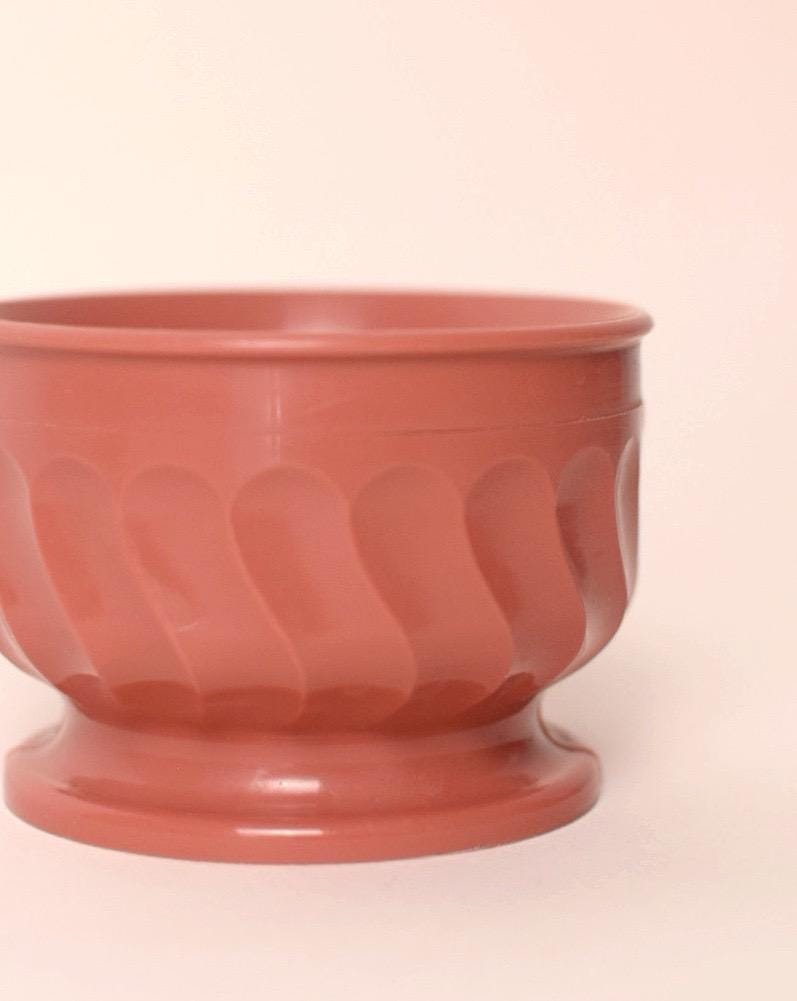 Color & Material: Dusty pink hard plastic, USA made. Vintage swirl design.
