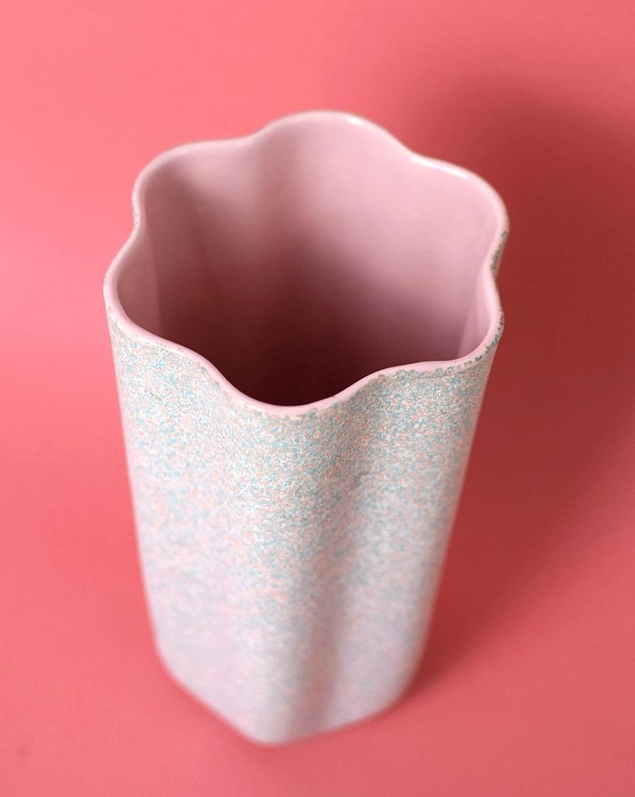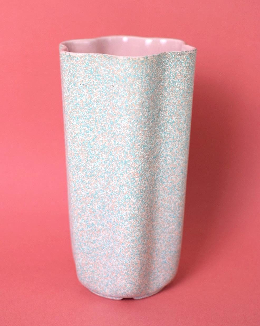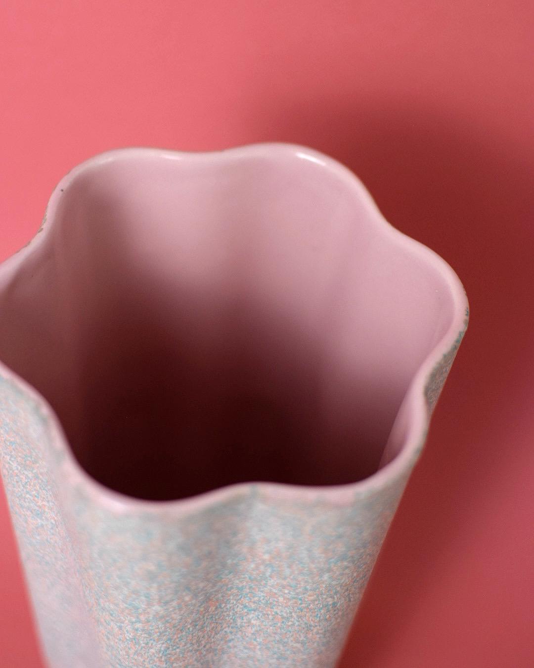 Eye-catching and iconic, this vintage ceramic vase features the sought-after atomic star pattern by Shawnee Pottery, model #1013, dating to the 1960s. Finished in a soft pink glaze with light teal speckles, this piece perfectly captures the playful optimism of mid-century modern design. The vase has a fun scalloped edge, and its interior is a shiny pink color.
