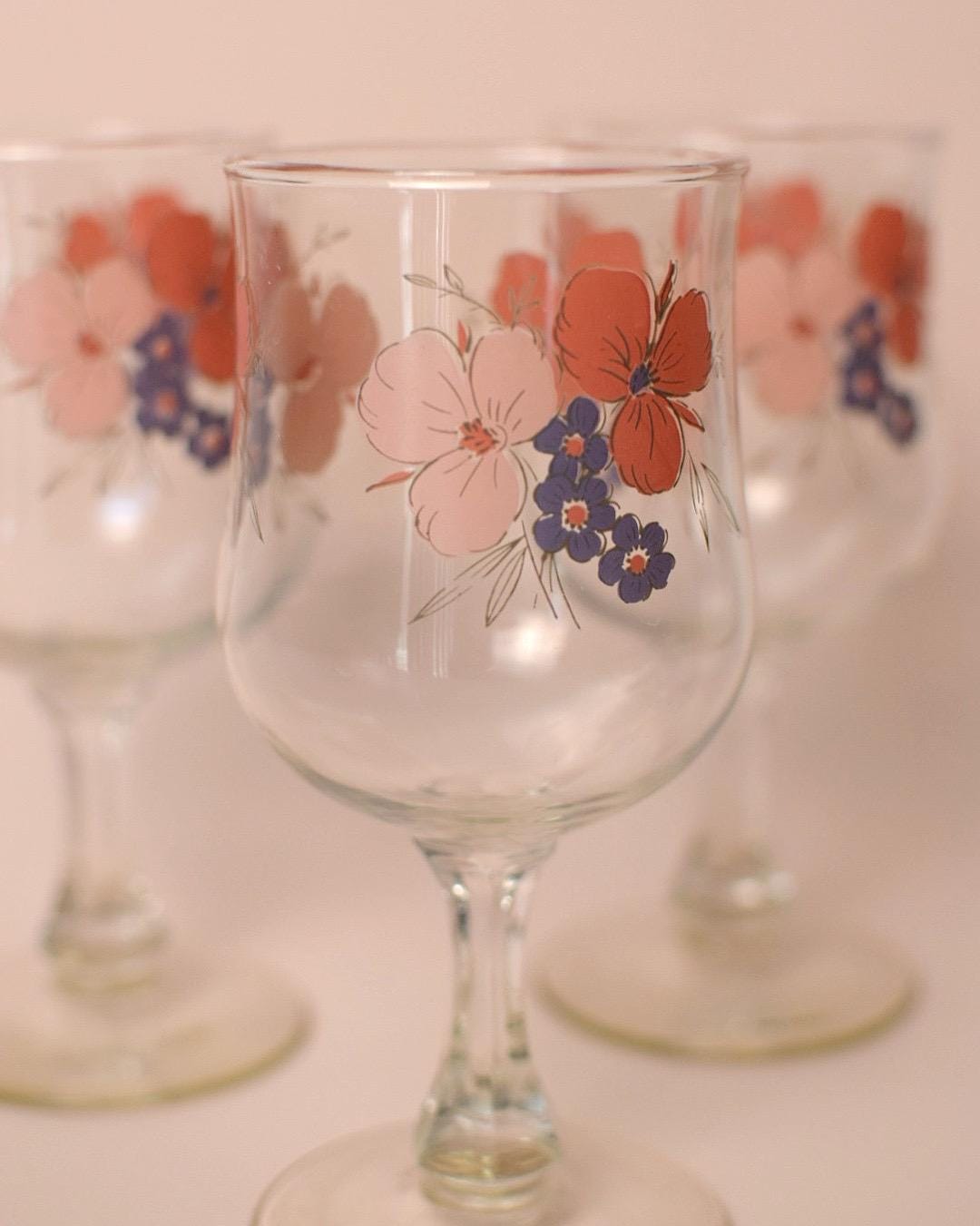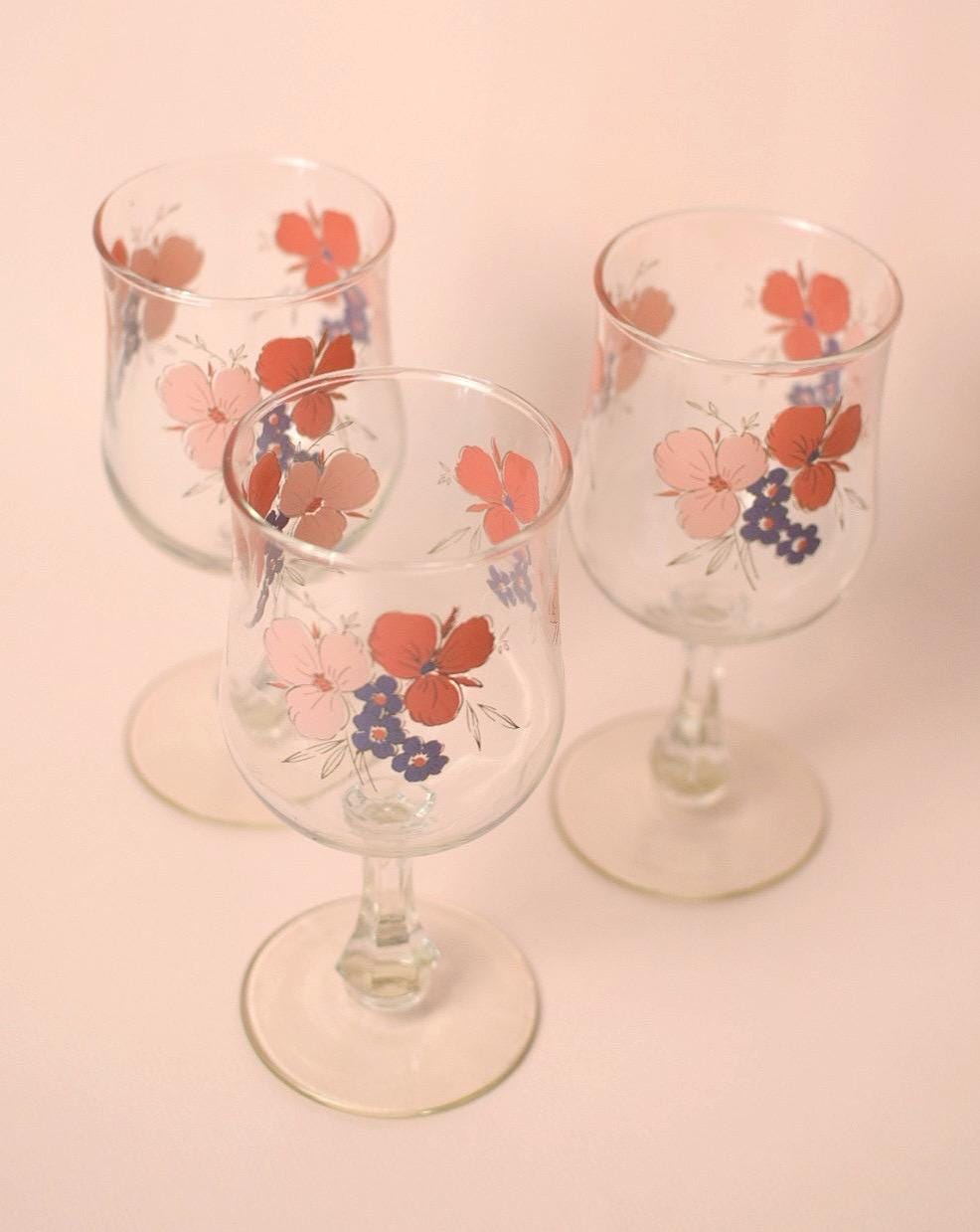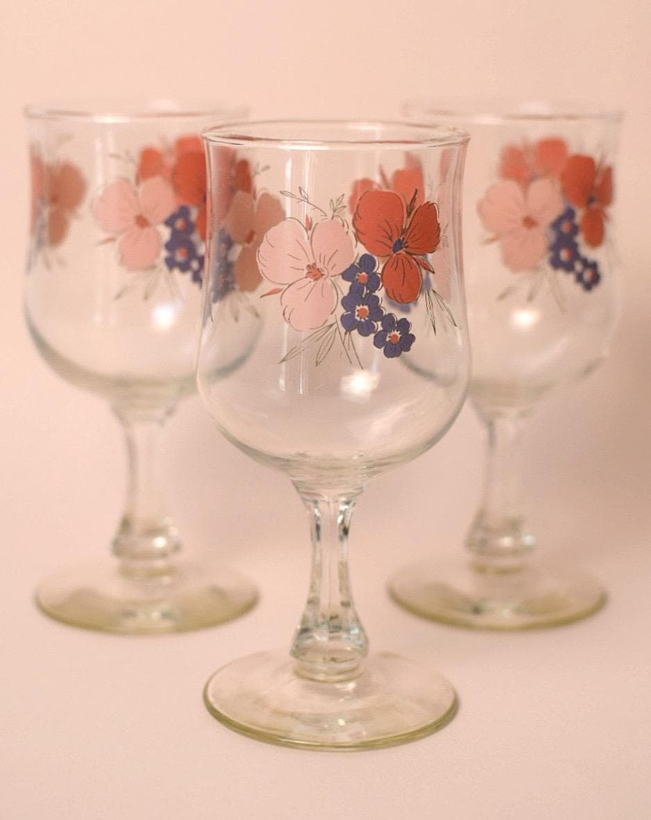 Set of 3 Vintage Floral Goblets by Galleria | 1980s Flower Wine Glasses | Cottagecore Garden Party Glassware