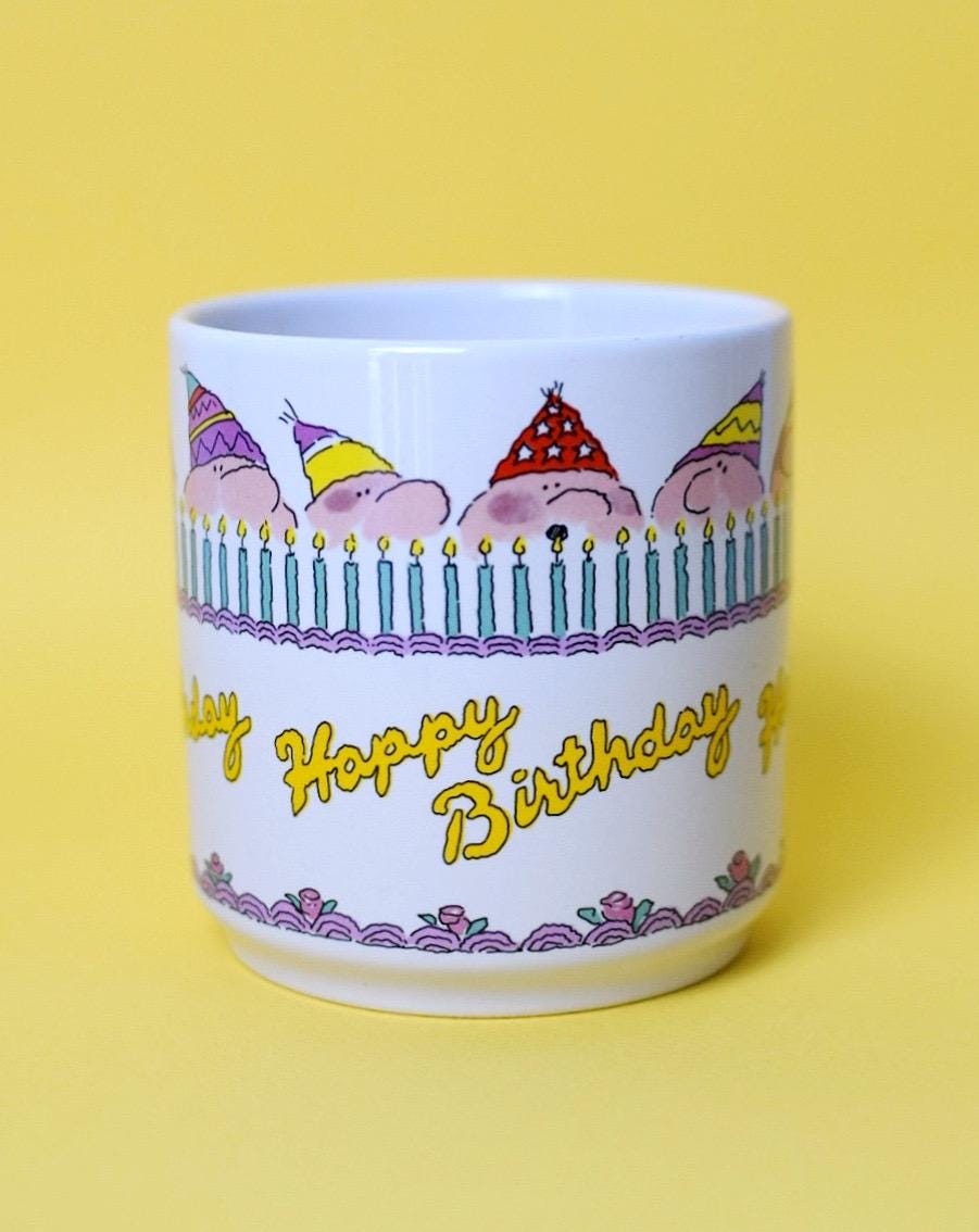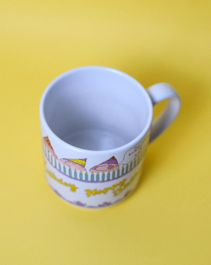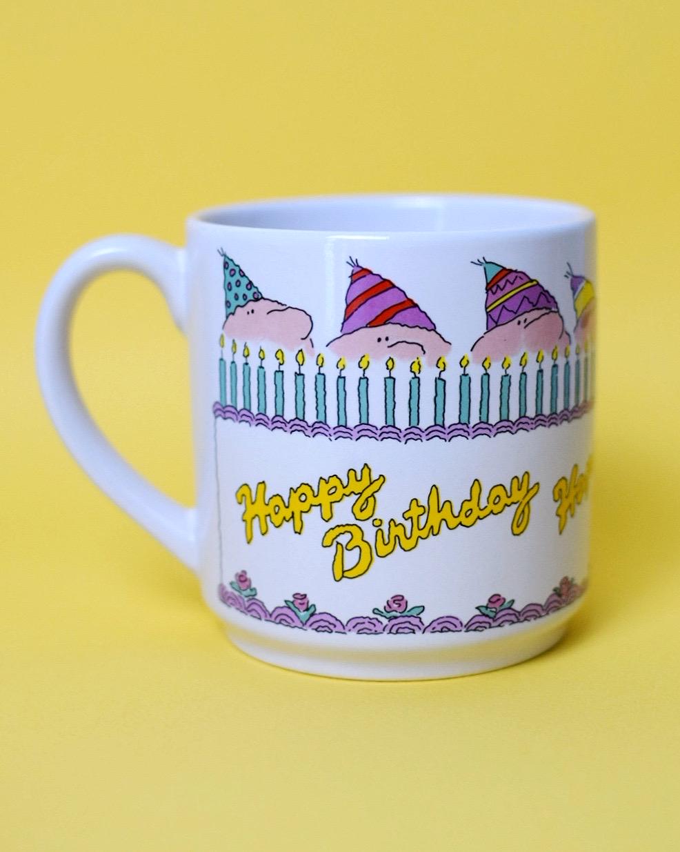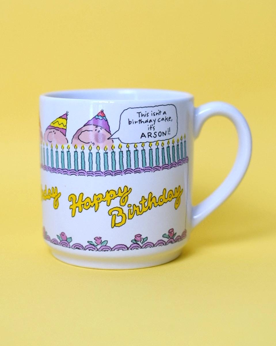Add some humor to your mug collection with this vintage birthday mug from Carlton Cards. The mug features artwork by cartoonist Suz Browning and says, “This isn’t a birthday cake, it’s arson!”