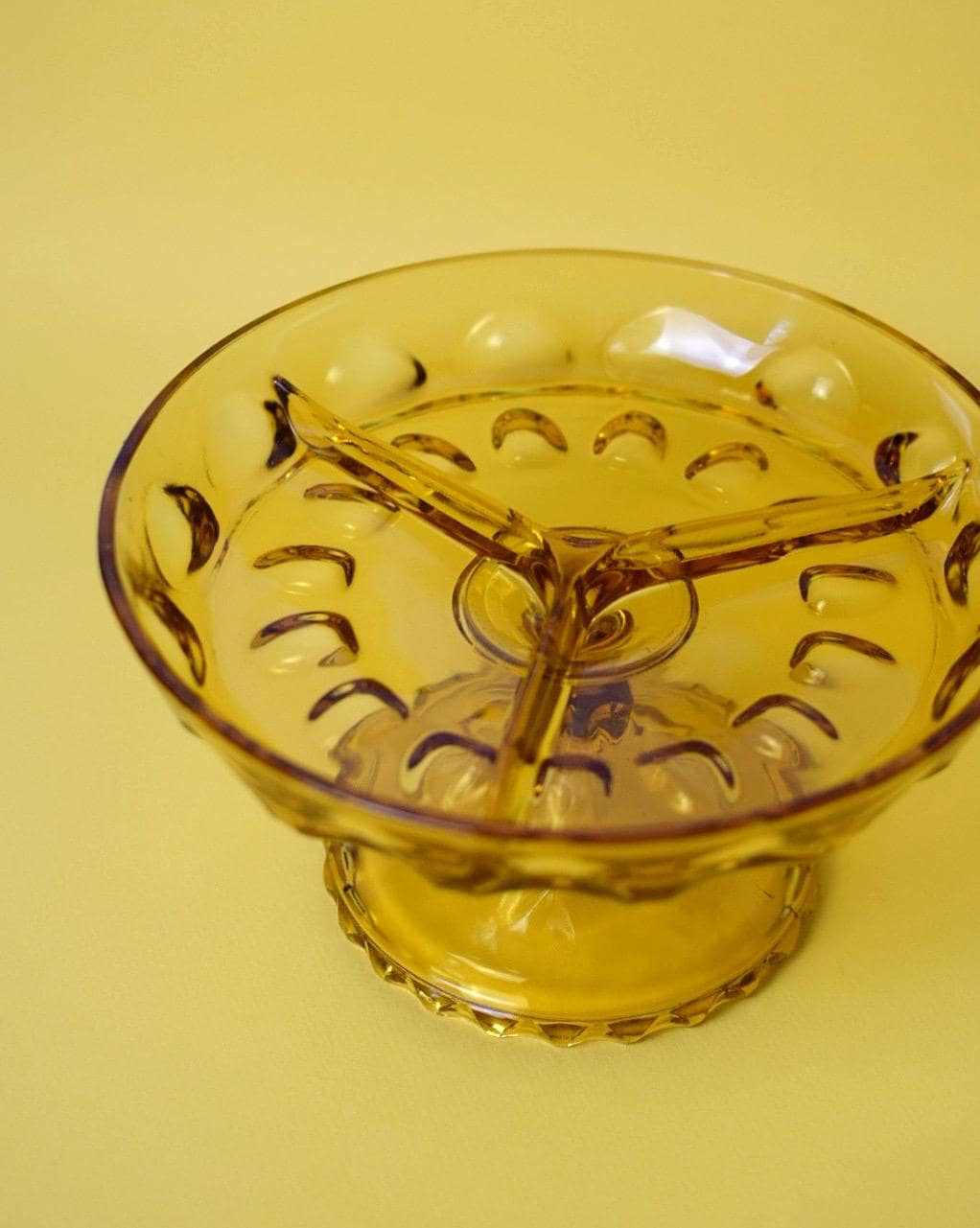 Beautiful vintage amber glass pedestal serving dish featuring a classic three-section divided design, perfect for serving relishes, nuts, candy, olives, or small appetizers. The vibrant amber color and elegant pedestal base give this piece a lovely mid-century modern vibe, making it both functional and decorative.