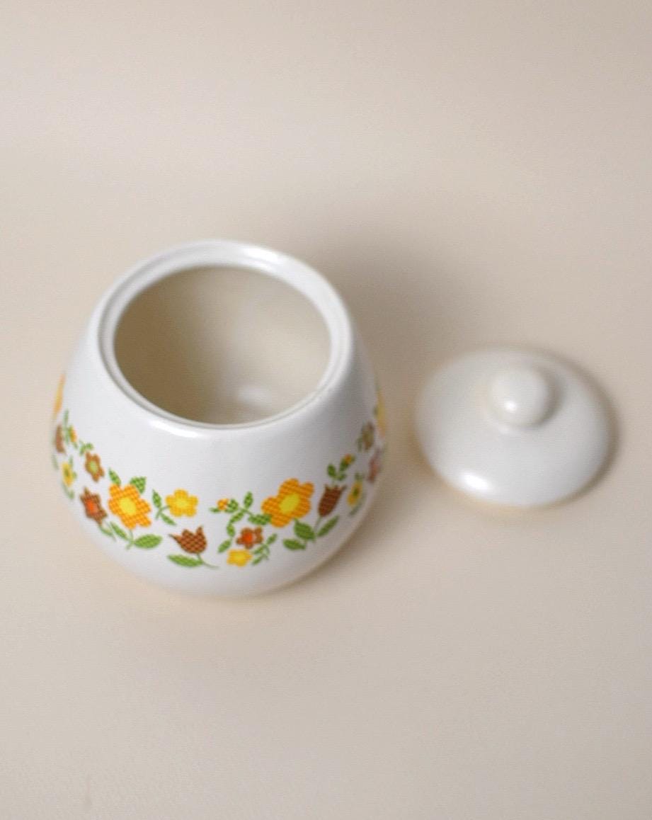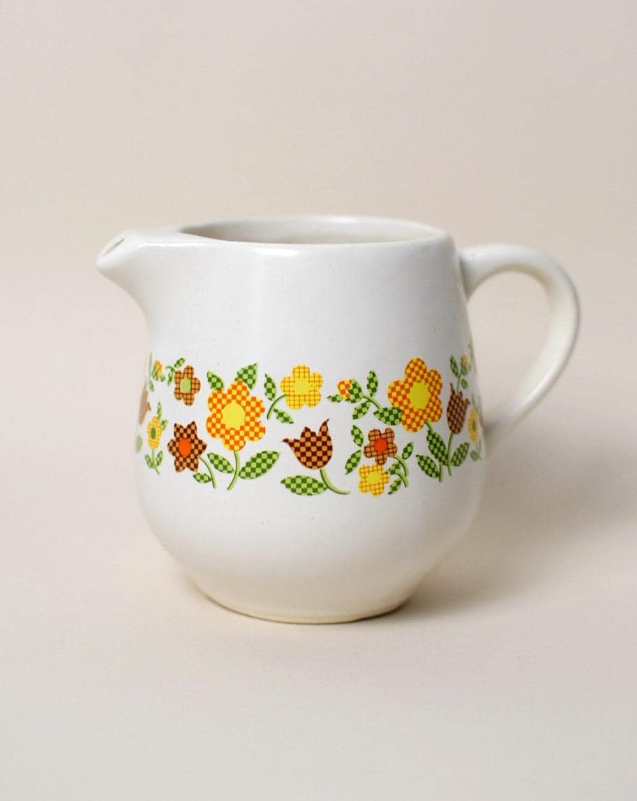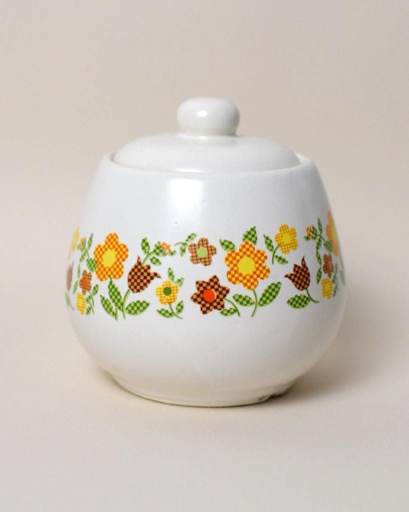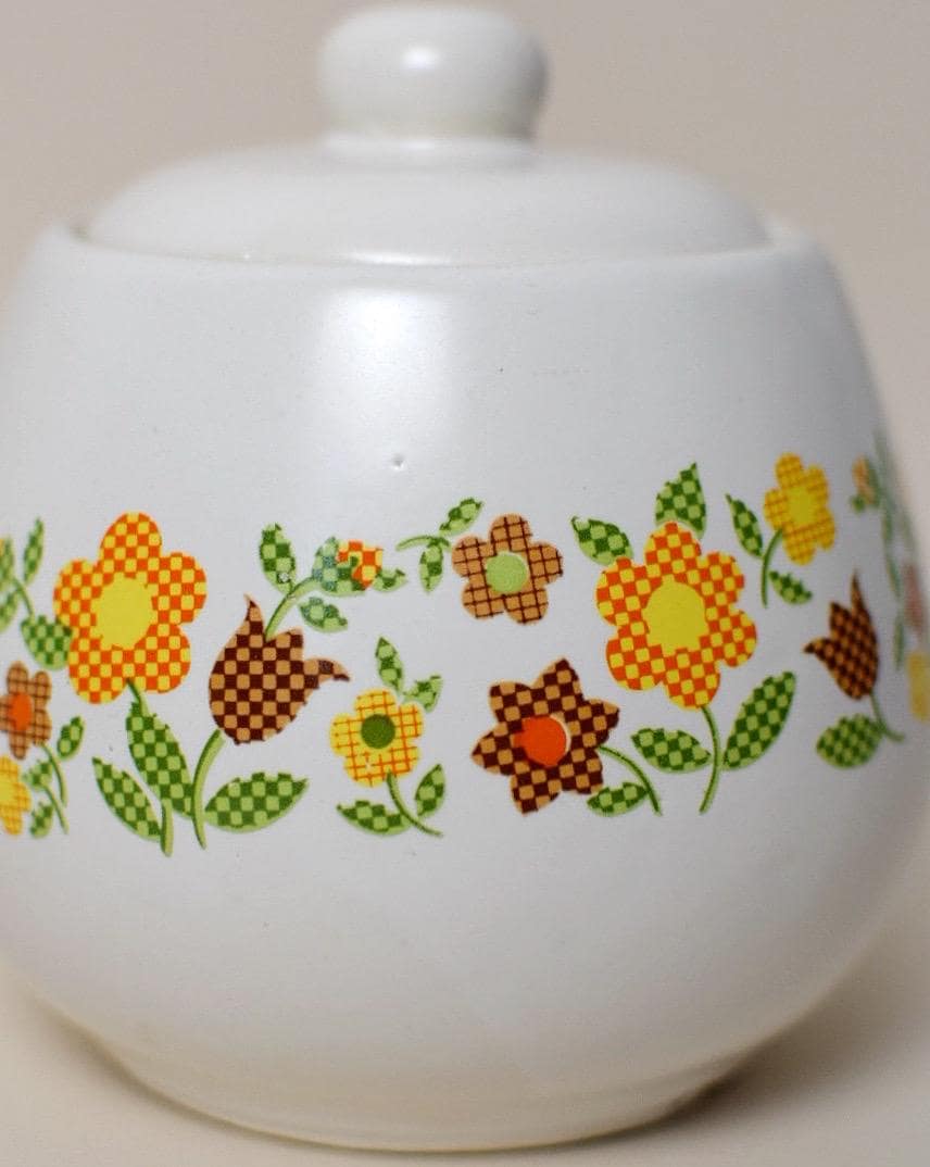 -Material and Design: Patchwork / Gingham Garden Collection. Retro green, orange, yellow and brown floral design. Ceramic with printed design.