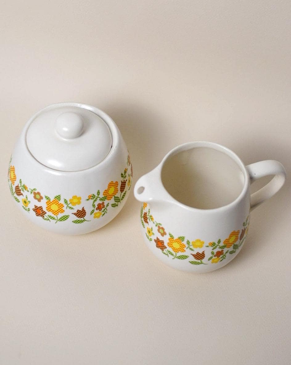 The pattern combines gingham checks and garden florals in a patchwork motif that feels warm, nostalgic, and perfect for cottagecore or vintage-inspired homes. The matching sugar bowl and creamer pitcher make a lovely addition to a coffee or tea station, open shelving display, or vintage kitchen collection.