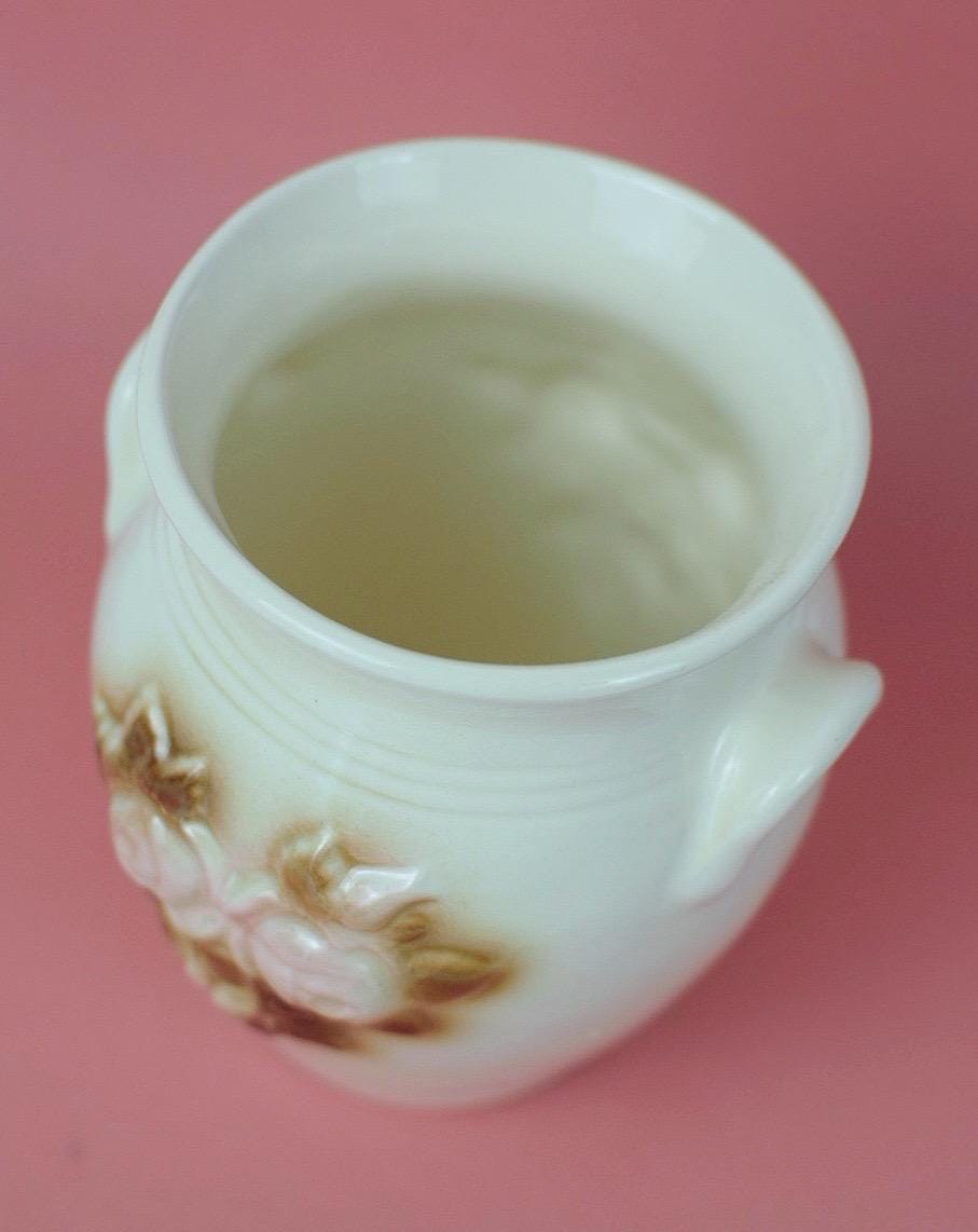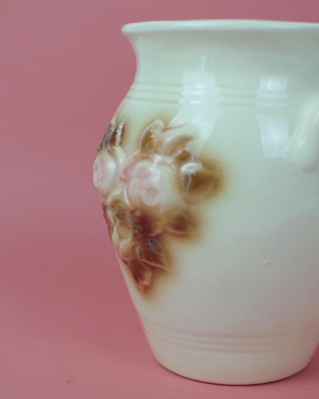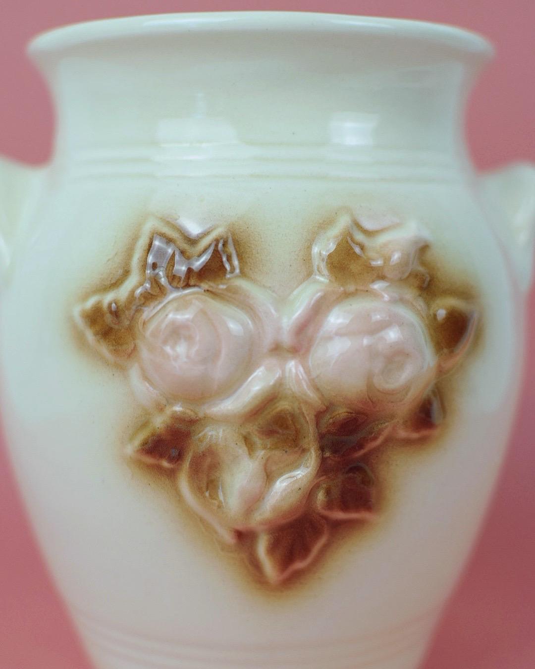 -Design and Materials: Heart-shaped crock style ceramic vase. Pink roses on a cream background.